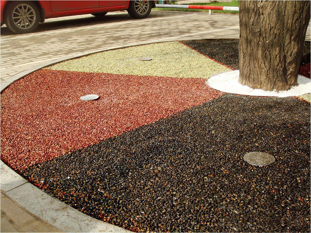 膠粘石透水路面是由改性高分子樹(shù)脂為膠結(jié)材料,將天然彩石、拋光色石、玻璃、水晶石、人造骨料等牢固地粘接在一起,鋪設(shè)在混凝土、透水混凝土、瀝青或級(jí)配砂石基層上的生態(tài)景觀地面鋪設(shè)材料,具有高效透水、自然美觀、色彩多樣、經(jīng)久耐用等特點(diǎn)??捎糜谕杆跃坝^道路、車型或人行道、公園和廣場(chǎng)等場(chǎng)所,也可應(yīng)用到室內(nèi)場(chǎng)所。